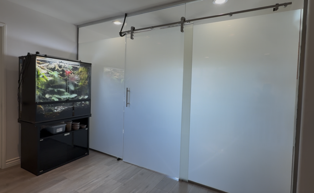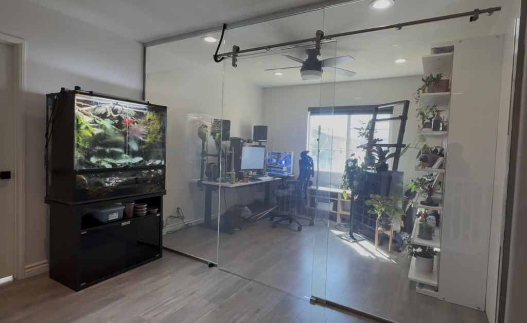 In 2024, we installed smart glass study room Buena Park for a homeowner who wanted on-demand privacy inside his second-floor home office. The space — surrounded by plants, an aquarium, and generous natural light — worked beautifully for focus, but needed a way to screen off the room during work calls and heads-down hours without losing any of that ambient light. We applied 85 sqft of PDLC switchable smart glass film to the existing glazing on the door and surrounding glass walls, wired into Alexa voice control.